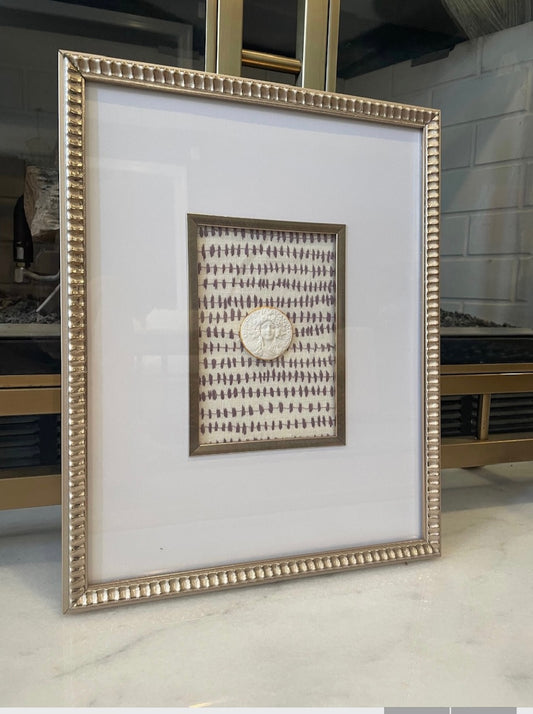 Scalloped Frame Intaglio with Purple and Cream Designer Fabric Background