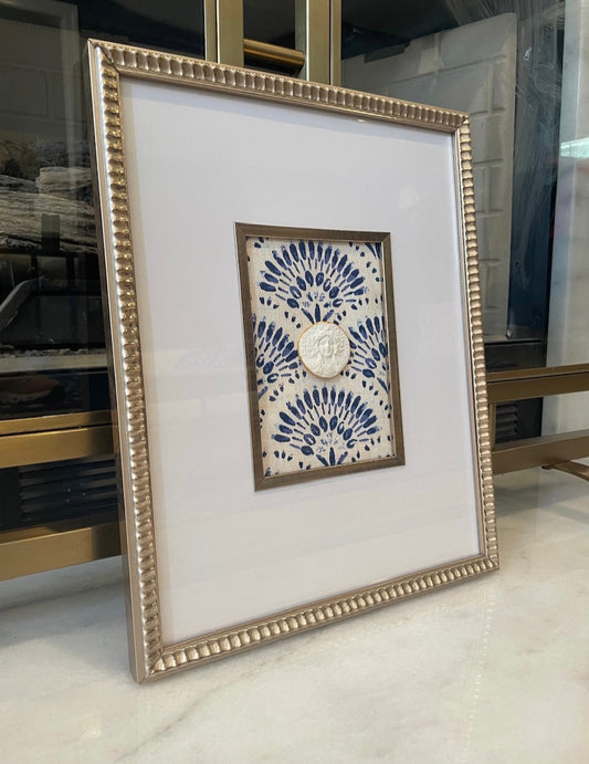 Scalloped Frame Intaglio with Blue and White Designer Fabric Background